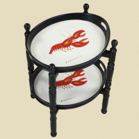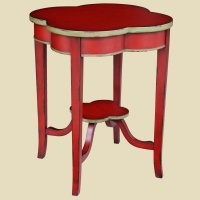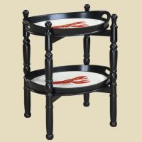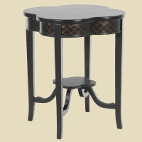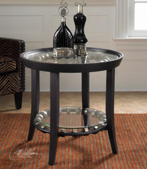 End Table is finished in satiny black with rubbed through edging, accented with silver leafed details. Tabletop and lower shelf are clear glass. Light assembly.