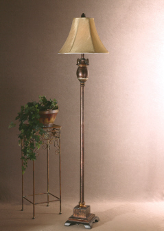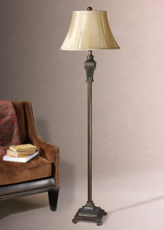 Golden bronze with antiqued black details. Silkened champagne textile shade.