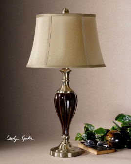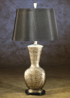 Distressed cocoa brown with silver and gold details. Silken champagne textile shade.