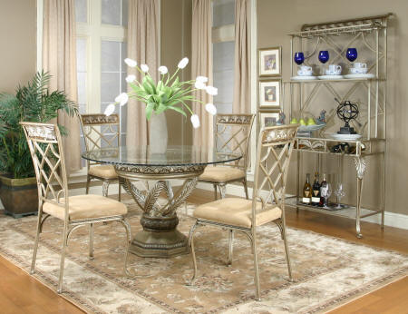 Antique silver finish with micro fiber padded seats accented by diagonal back design with roll top leaf design. Thick scalloped edge glass top with leaf design metal base.